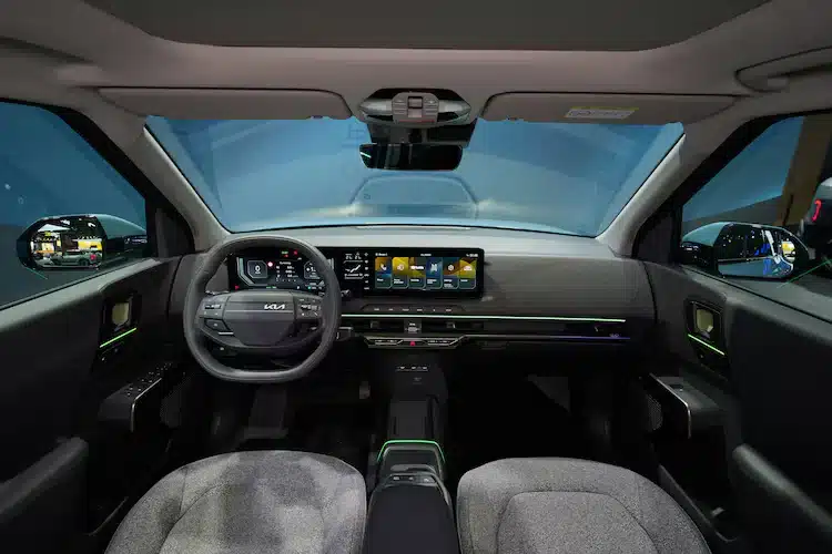 The cabin of the EV2 features a modern, screen-heavy layout similar to larger Kia EVs. The focus is on connectivity and ease of use.